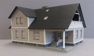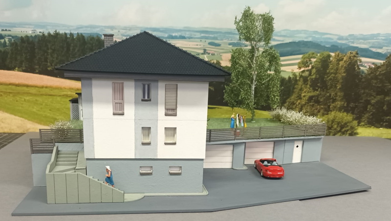 Ein Einfamilienhaus mit Gartenhäuschen und Doppelgarage